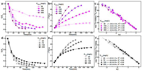 (a) Effect of initial concentrations of KMnO4 on the oxidative degradation of TCE in the KMnO4 reaction. (b) The evolution of δ13C values of TCE with initial concentrations of KMnO4. (c) The variation of Rayleigh plots of TCE with respect to initial concentrations of KMnO4. Experimental boundary conditions: [TCE]0 = 75 mg/L at initial suspension pH 8. (d) Effect of initial concentrations of TCE on the oxidative degradation of TCE in the KMnO4 reaction. (e) The evolution of δ13C values of TCE with initial concentrations of TCE. (f) The variation of Rayleigh plots of TCE with respect to initial concentrations of TCE. Experimental boundary conditions: [KMnO4]0 = 250 mg/L at initial suspension pH 8.