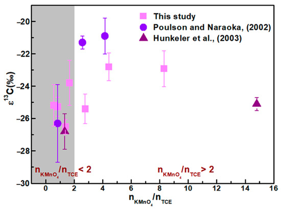 While previous studies concluded that ε values remain unaffected by excess or insufficient TCE, our results suggest a subtle dependence on the n(KMnO4)/n(TCE) ratio (Figure 2). As this ratio increases, ε values also tend to increase, possibly due to the shifts in relative contributions of KMnO4 and MnO2 in the oxidation process. Under KMnO4-limited conditions (n(KMnO4)/n(TCE) < 2), MnO2 colloids formed during the reaction may oxidize residual TCE, slightly altering the carbon isotope effect [41,55]. When TCE was excess, KMnO4 was quickly consumed by TCE, and the proportion of MnO2 oxidizing TCE was elevated. There may be a difference between the ε values of KMnO4 oxidized TCE and MnO2 oxidized TCE, resulting in a small change in the overall ε values at a higher degree of participation of MnO2 oxidized TCE, which needs to be further investigated.