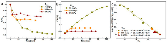 (a) Effect of initial concentrations of TCE on the oxidative degradation of TCE in the KMnO4 reaction. (b) The evolution of δ13C values of TCE with initial concentrations of TCE. (c) The variation of Rayleigh plots of TCE with respect to initial concentrations of TCE. Experimental boundary conditions: initial suspension pH 8.