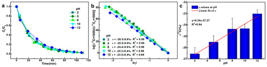 (a) Effect of pH on the oxidative degradation of TCE in the KMnO4 reaction. (b) The evolution of stable carbon isotope fractionation of TCE with pH. (c) The variation of ε values of KMnO4 degradation of TCE at pH 2~12. Experimental boundary conditions: [TCE]0 = 75 mg/L and [KMnO4]0 = 250 mg/L at initial suspension pH 8.