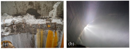 Since 1987, nearly 150 shafts constructed by using the freezing method in coal, metal, and chemical mines across eastern, central, northeastern, and northwestern China have suffered from shaft lining cracks due to soil settlement [1,2]. The main manifestations include horizontal circular compression cracks in the soil layer and the underlying weathered rock layer [3], large-scale spalling of concrete, and inward bending of longitudinal reinforcing steel, often accompanied by water leakage (Figure 1a) [4,5]. In severe cases, sand inrushes and mud bursts have occurred at the cracked sections of the shaft lining (Figure 1b), posing significant safety hazards [6].