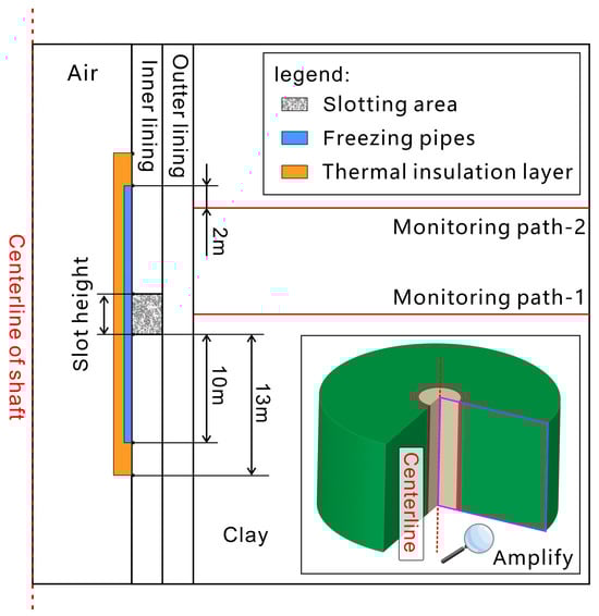 A 3D numerical model was used to calculate the heat transfer in the slotting zone. The model’s dimensions were Φ 100 m × 50 m, and the diameter of the outer edge of the shaft was 9 m. The dimensional parameters of the freezing zone and insulation layer are shown in Figure 5. The boundary between the strata was a constant temperature boundary. MATLAB R2023b and LiveLink [33] were used to simulate the slotting of the shaft lining by replacing the physical properties of concrete in the COMSOL 6.0 numerical model with those of air. The parameter values and ranges were extracted from representative coal mine shafts crossing deep soil layers, such as Longgu and Wanfu [28,29,34] (Table 2). We used representative values to ensure the generalizability of the research results.