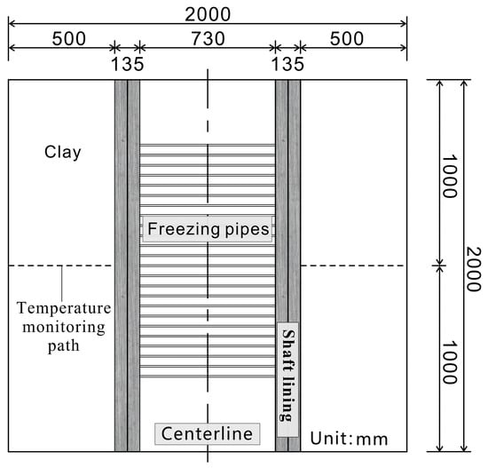 The model and computational method was validated by performing physical simulation experiments before conducting numerical simulations. Due to the size constraints of experimental equipment and the installation requirements of thermal insulation layers within the model, this study adopted a geometric scaling ratio of 9 for the physical model. Consequently, the shaft has an inner diameter of 730 mm, an outer diameter of 1000 mm, and a lining thickness of 135 mm, as shown in Figure 6. In the physical model, the initial ground temperature was 20 °C, and localized freezing was achieved by circulating low-temperature alcohol through square copper tubes with an inlet temperature of −50 °C. A thermally conductive adhesive (WH-800) was utilized to improve heat conduction efficiency, and the ventilation conditions within the shaft were simulated using a blower system. The inner and outer boundaries of the physical model are set as adiabatic boundaries by arranging insulation layers. Photos of the experiments are shown in Figure 7.