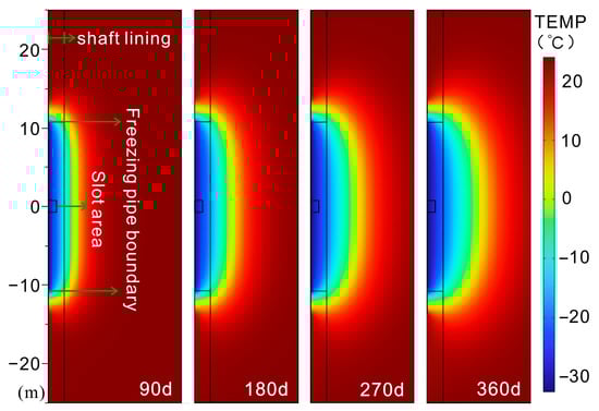 The temperature field evolution under typical parameters (freezing temperature T f = −30 °C, initial stratum temperature T 0 = 24 °C, and shaft lining thickness H = 2 m) is illustrated in Figure 9. As localized freezing occurs around the shaft lining, a low-temperature zone is formed, and the thermally conductive adhesive extracts heat from the concrete shaft lining and the surrounding strata. Due to the thermal transfer, a freezing front forms and expands into the clay stratum, forming a freezing curtain covering the outer periphery of the shaft lining. The thickness of the freezing wall reaches 1.2 m on the 123rd day, meeting the slotting criteria. The freezing wall expands gradually from the inner to the outer part. This growth pattern provides ample drainage pathways for unfrozen water, preventing the formation of unfrozen water pockets between the freezing wall in the clay and the shaft lining and significantly reducing the risk of frost-heave-induced damage.