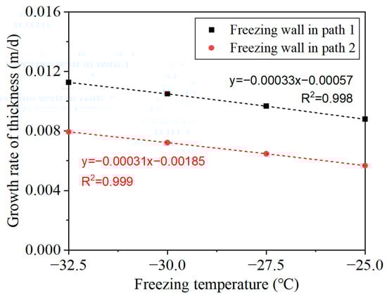 The average growth rate of the freezing wall for different shaft lining thicknesses is shown in Figure 17. The growth rate was 0.0083–0.0123 m/d in Monitoring Path 1 and 0.0051–0.0091 m/d in Monitoring Path 2. It was linearly negatively correlated with the freezing temperature. The average change rate of the growth rate was −0.00262 m/(d·m) in Monitoring Path 1 and −0.00267 m/(d·m) in Monitoring Path 2.