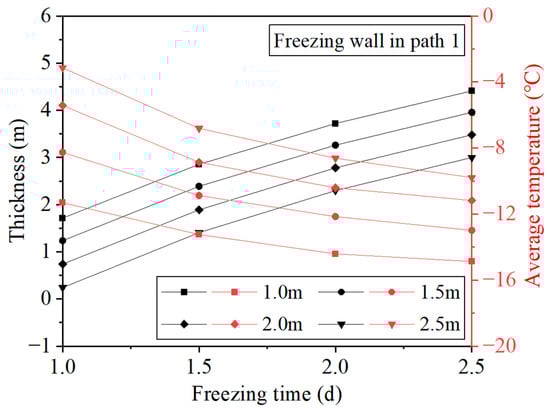 The evolution of the freezing wall thickness and average temperature in Monitoring Path 2 for different shaft lining thicknesses is shown in Figure 16. The freezing wall thickness in Monitoring Path 2 was 0.78–2.24 m, and the average temperature was −4.71 °C to −11.58 °C after 180 days of freezing for shaft lining thickness values of 1.0–2.5 m. After 360 days, the thickness was 1.85–3.28 m, and the average temperature was −6.79 °C to −12.53 °C. As the freezing duration increased, the difference in the freezing wall thickness between adjacent shaft lining thickness values did not change significantly, whereas the difference in average temperature decreased. After 180 days of freezing, the thickness difference of the freezing wall ranged from 0.47 m to 0.5 m, and the average temperature difference was 2.09 °C to 2.63 °C. After 360 days of freezing, the thickness difference was 0.47 m to 0.48 m, and the average temperature difference was 1.71 °C to 2.22 °C.