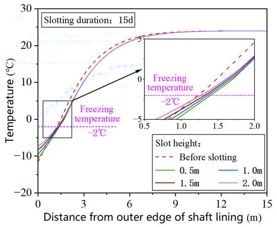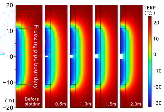 The nephogram of the temperature field for different slot heights after 15 days is shown in Figure 18. Convective heat transfer occurred between the air inside the shaft and the exposed concrete shaft lining in the slotting zone, forming a warming zone. As the upper and lower freezing pipes operated normally during slotting, few temperature changes occurred in the concrete above and below the slotting zone. Thus, the warming zone expanded horizontally. As the height of the slotting zone increased, the exposed area increased, expanding the horizontal influence range of the warming zone. The upper and lower freezing pipes transferred the cooling capacity to the freezing wall in the stratum through the low-temperature shaft wall, and the temperature field at the outer edge of the freezing wall was unaffected by the slotting operation.