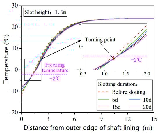 The temperature evolution in Monitoring Path 1 for different slotting durations is illustrated in Figure 22. As the slotting duration increased, the horizontal range of the warming zone adjacent to the slotting zone increased. The upper and lower freezing pipes near the slotting zone extracted heat from the concrete shaft lining and the surrounding clay stratum. Due to the combined effects of convective heat transfer in the slotting zone and the cooling caused by the freezing pipes, a turning point (Figure 22) occurred on the temperature curve at 1.21–1.22 m from the outer edge of the outer shaft lining. When the distance from the outer edge of the outer shaft lining was less than the value of the turning point, the temperatures increased with the slotting duration. In contrast, the temperature decreased at positions larger than this value.