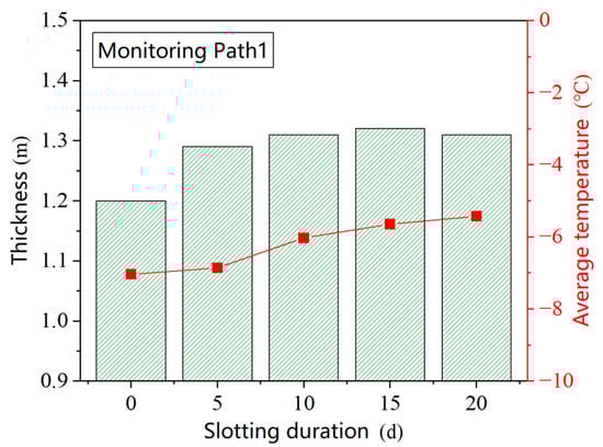As depicted in Figure 22 and Figure 23, the freezing wall expanded outward during slotting at a freezing temperature of −2 °C. The rate of increase in the thickness of the freezing wall increased and decreased with the slotting duration, reaching the maximum value on the 15th day of slotting. Conversely, the average temperature increased during the slotting period. The freezing wall thicknesses were 1.29 m, 1.31 m, 1.32 m, and 1.31 m after 5 days, 10 days, 15 days, and 20 days, respectively, at a slot height of 1.5 m, and the average temperatures were −6.86 °C, −6.03 °C, −5.65 °C, and −5.43 °C. The thickness of the freezing wall was 0.09 m, 0.11 m, 0.12 m, and 0.11 m larger, and the average temperature was 0.18 °C, 1.01 °C, 1.39 °C, and 1.61 °C higher after slotting than before slotting.