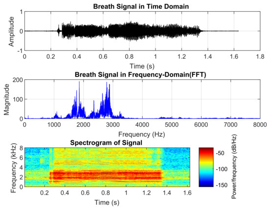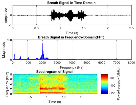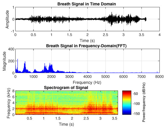 Normal breath sound analysis. (upper) Time-domain waveform. (middle) Frequency spectrum. (lower) Spectrogram.