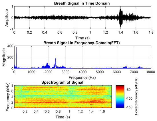 Asthma breath sound analysis. (upper) Time-domain waveform. (middle) Frequency spectrum. (lower) Spectrogram.
