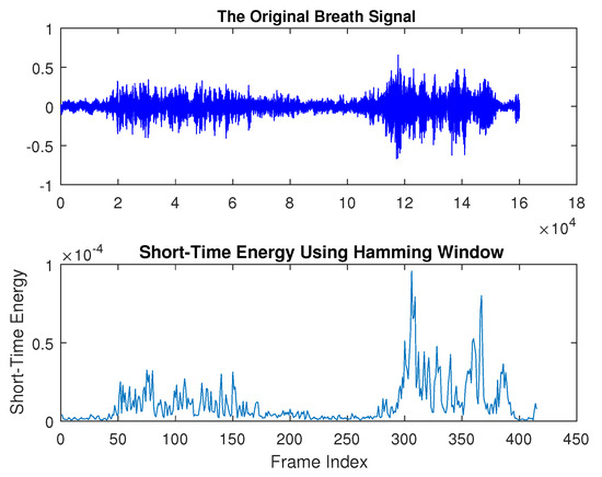 A breath signal refers to the sound waveform spanning from the start point to the end point of a breath sound segment. Breath and silent segments differ in their short-time characteristics, with the most notable being short-time energy (STE): breath segments exhibit higher STE, while silent segments show lower STE. This distinction allows STE to be used for identifying the boundary points of each breath segment. STE is calculated as the average of the squared sample values within a defined window and is mathematically expressed as [46]
