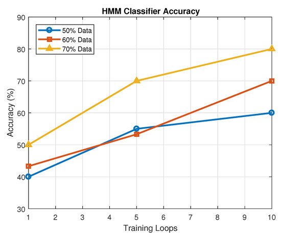 Accuracy of HMM classifier vs. training loops for different training data portions.