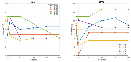 To evaluate the efficacy of artificial neural networks (ANNs) for breath sound recognition, we conducted experiments using Linear Predictive Coding (LPC) features. The classification accuracy, as a function of training data proportion and training iterations, is presented in Figure 10. Our analysis revealed that the neural network weights converged after approximately 50 iterations. Furthermore, satisfactory training performance was achieved with 50% to 60% of the total breath sound training dataset, resulting in a classification rate of approximately 70%. Subsequently, we investigated the performance of ANNs using Mel–Frequency Cepstral Coefficients (MFCCs) as input features. Again, we varied the training data proportion and the number of training iterations. In this configuration, neural network convergence was observed after roughly 50 iterations, and a training dataset comprising 70% to 80% of the total data yielded optimal results. While the classification rate using MFCC features alone was approximately 70%, the highest achieved classification rate was %, indicating potential for improved performance with optimized training parameters.