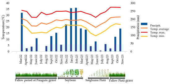 To determine the dry matter yield of Paiaguás grass, plant samples were collected on 15 October 2022 using a 1.0 × 1.0 m sampling frame per experimental plot. The collected plants were placed in labeled plastic bags and weighed using a precision balance to determine fresh matter (FM). Subsamples were then taken, placed in paper bags, and oven-dried at 65 °C for 72 h to determine dry matter (DM), which was extrapolated to yield per hectare. Paiaguás grass was desiccated on 17 October 2022 using glyphosate (1560 g ha−1 active ingredient (a.i.)) to prepare for the next crop in the rotation.