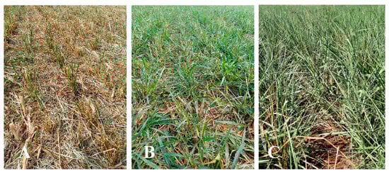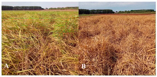 After harvesting the intercropping system, the area remained fallow with Piatã grass (Figure 5). On 6 October 2023, for the dry matter yield determination of Piatã grass, a 1.0 × 1.0 m sampling frame was used to collect plants within 1 m2 of each plot. These plants were placed in properly labeled plastic bags and weighed on a precision balance for FM determination. Again, after this procedure, subsamples were taken, placed in paper bags, and taken to a forced-air oven at 65 °C for 72 h to obtain DM, which was later extrapolated to production per hectare. The Piatã grass was desiccated on 13 October 2023 using the herbicide glyphosate (1560 g ha−1 of active ingredient) to proceed with the next crop rotation.