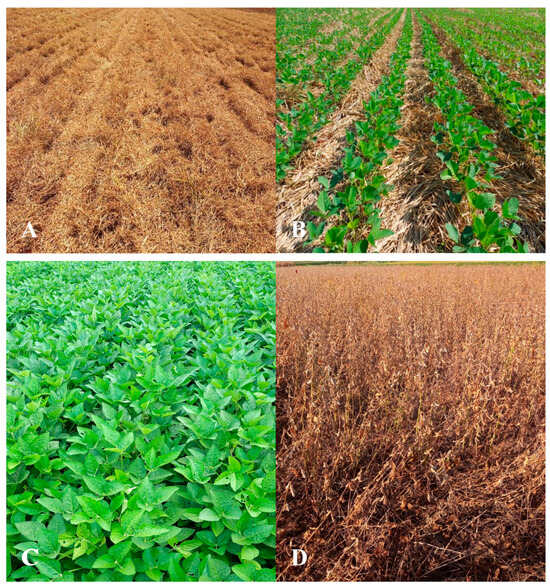 Next, soybean (Glycine max, cultivar 97R50IPRO) was sown (Figure 3) on 8 November 2022. Seeds were inoculated with Bradyrhizobium japonicum (strains SEMIA 5079 and SEMIA 5080) at 185 mL per 50 kg of seed immediately before sowing in a shaded area. Sowing was performed mechanically using a no-till seeder with a shank-type furrow opener at a depth of approximately 0.05 m, with a row spacing of 0.45 m, a seeding rate of approximately 14.4 seeds m−1, and fertilization with 136 kg ha−1 of KCl.