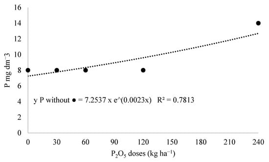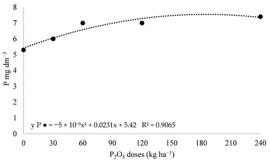 Regarding the phosphorus dose variation, a significant quadratic relationship was observed for soil phosphorus content in the 0.00–0.10 m layer, as illustrated in Figure 6. The regression analysis revealed a maximum P content at the calculated dose of 192.5 kg ha−1 of P2O5, suggesting a saturation point beyond which additional phosphorus did not lead to proportional increases in soil P levels. This finding is essential to understanding phosphorus dynamics under no-till systems, as it highlights the limit of soil retention capacity and may reflect factors such as plant uptake, microbial immobilization, or sorption. Thus, the regression model supports more precise recommendations for phosphorus management in tropical soils.