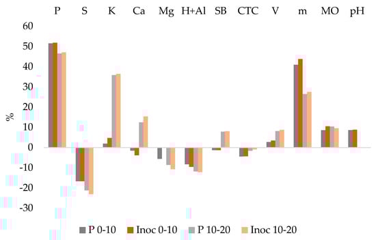 Comparing the results of the two analyzed layers, it can be observed that the levels of P, K, Ca, Mg, BS, CEC, V%, and OM decreased in deeper layers, whereas m% and pH increased. S levels increased with higher P2O5 doses (starting from 60 kg ha−1) and also in the inoculated area. Only H+Al remained constant at both depths.