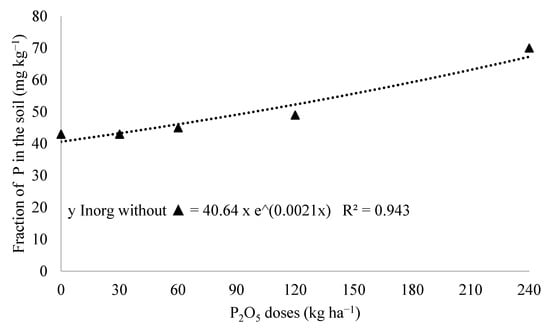 The rate of P immobilization depends on the quality of decomposing residues and the availability of carbon and nitrogen in the soil. If the P concentration in residues exceeds cellular demand, an increase in available inorganic P through mineralization is observed []. This supports the exponential increase in inorganic P in areas with the highest residual doses (240 kg ha−1 of P2O5) (Table 19) and non-inoculated areas (Figure 10), which also exhibited the highest total dry matter productivity (Table 23). Conversely, if these residues have P concentrations below microbial biomass requirements, P must be supplied from the available inorganic P pool in soil solution, thereby depleting soil solution P []. This indicates that there was no P deficiency in the experimental area, regardless of treatment, as the crop obtained adequate P for development and production either through enhanced absorption efficiency due to inoculation (inoculated areas) or the greater volume of dry matter in non-inoculated areas. In this context, it is crucial to consider the specific conditions of the experimental area, which may have influenced the soil nutrient dynamics and plant responses.