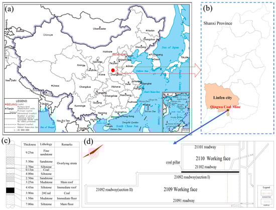 Geographic location of Qingwa Mine: (a) location of Qingwa Mine in China; (b) location of Qingwa Mine in Linfen City; (c) the histogram of the 2109 working face; (d) the 2109 and 2110 working face layout.