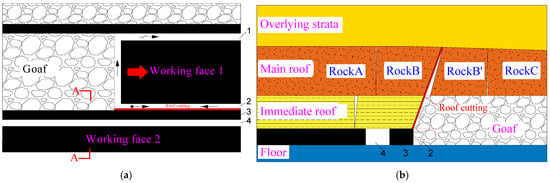 NCPDRE layout: (a) narrow coal pillar double-lane excavation layout; (b) A-A section (1—this section’s return-air roadway; 2—this section’s air-inlet roadway; 3—coal pillar; 4—next section’s return-air roadway).