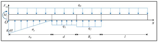 Here, q0 is the load of the overlying rock strata; x0 is the plastic zone width of the roadway, and σy is the supporting pressure of the coal rib. d is the width of the roadway, and q1 is the support resistance; Bc is the coal pillar width, and q2 is the bearing load of the coal pillar to the roof; l is the immediate roof length in the goaf.