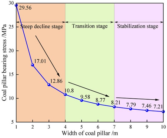 Substituting the data into Equation (8), the variation in the width of the coal pillar and the supporting stress of the coal pillar was determined, as shown in Figure 4. The support stress with the change in the coal pillar width was divided into three stages: the steep decline stage (0~4 m), the transition stage (4~7 m), and the stabilization stage (>7 m). In the stage of steep decline, the supporting stress of the coal pillar is greater than its ultimate strength, resulting in the plastic failure state of the coal pillar. If the coal pillar width is set in this range, and high-strength reinforcement measures need to be taken to increase the supporting load of the coal pillar exerted on the roof, the roadway is centrally supported at the same time; consequently, the deformation of the surrounding rock of the roadway is controlled, and the supporting pressure of the coal pillar is reduced simultaneously. In the transition stage, the supporting stress of the coal pillar is within the range of ultimate strength, and when the width of the coal pillar continues to increase to more than 7 m in the stabilization stage, the supporting load of the coal pillar is further reduced. The coal pillar in this width range has a certain strength margin, and the support stress can be further reduced after taking it into account to avoid the instability and damage of the coal pillar in a certain area and ensure the overall stability of the coal pillar, but the specific size of the coal pillar needs to be further explored.
