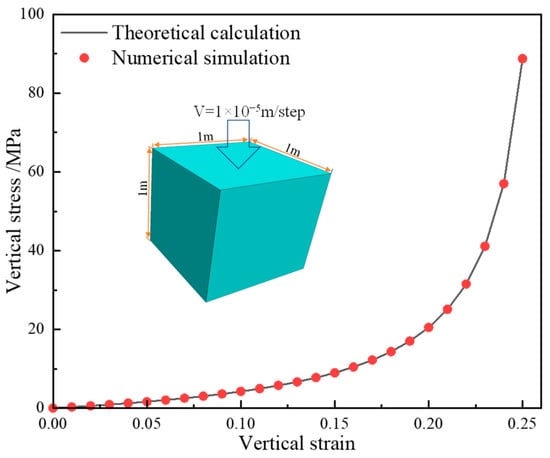 According to the inversion data in Table 3, a FLAC3D numerical simulation model of a cube with an edge length of 1 m was established, the velocity boundary was fixed around and at the bottom, and then a fixed velocity of 1 × 10−5 m/step was applied to the top for loading. The vertical stress of the Z = 0 plane was obtained by writing the FISH function, and then the model stress and its displacement at each time step were recorded using the history command of FLAC3D. The vertical stress–strain curve of the numerical model was then drawn. Comparing the numerically inverted curve with the theoretically calculated curve in Figure 5, it can be seen that the numerical simulation curve obtained using the cap pressure method is close to the theoretical curve. The parameters of the goaf double-yield model are shown in Table 4.