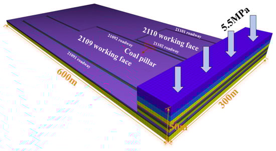 After the model parameters were determined, the numerical simulation was performed according to the parameters of the 2109 and 2110 working faces of Qingwa Mine, as shown in Figure 6. The dimensions of the model were 600 m × 300 m × 50 m, and a stress of 5.5 MPa was applied at the top of the model, aiming to simulate the load of the overlying rock strata layer. The surrounding area and the bottom were limited by speed as the boundary condition, and boundary coal pillars of 30 m in width were left on both sides of the working face. The numerical simulation parameters are the mechanical parameters in Table 5.