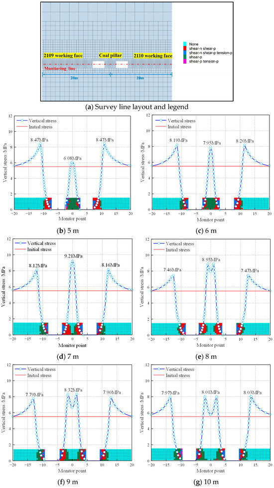 When the coal pillar width was relatively narrow (5–7 m), the corresponding bearing capacity increased gradually. During this phase, stress superposition within the coal pillar was more pronounced, resulting in a single-peak distribution of vertical stress. Consequently, the peak stress within the coal pillar increased progressively. Although the coal pillar exhibited some bearing capacity, the plastic zone either penetrated entirely or posed a risk of penetration. In such cases, external mining disturbances can easily cause the yielding and destruction of the coal pillar, leading to relatively low peak stress values. Conversely, when the coal pillar width was wider (8–10 m), stress superposition weakened, and the peak stress within the coal pillar exhibited a double-peak distribution. As a result, the peak stress showed a gradual decreasing trend.