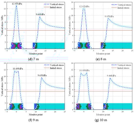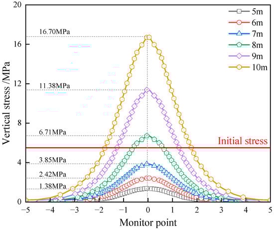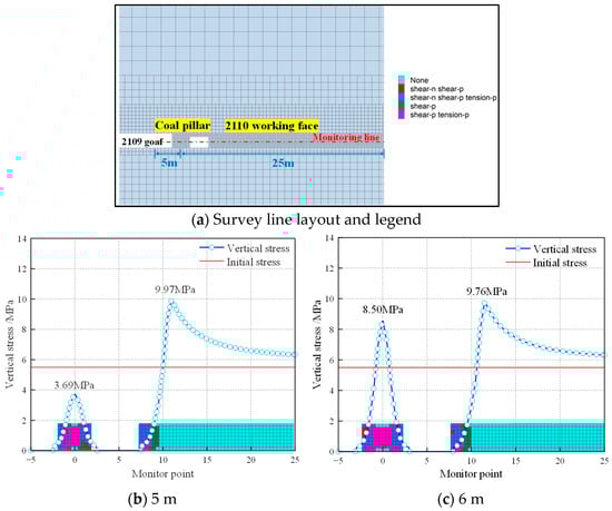 To analyze the bearing characteristics of the coal pillar during the first mining of the 2109 working face, the simulation was terminated when the mining distance was equal to the width of the working face. The measurement line arrangement, as depicted in Figure 8a, was established with the coal pillar’s center as the origin. This setup facilitated the acquisition of vertical stresses within the coal pillar grid spanning from −5 m to +25 m. The findings are as follows: