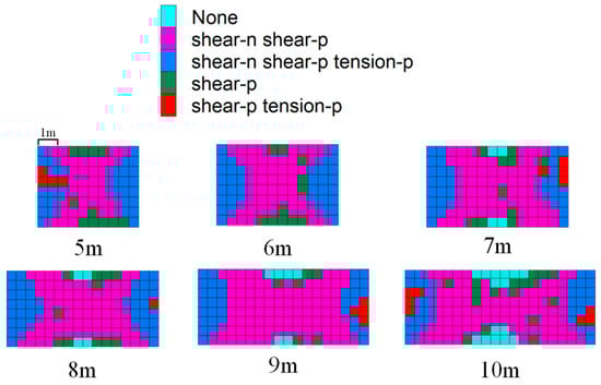 - The analysis of the plastic zone contour diagram reveals that the lattice structures of both 5 m and 6 m coal pillars underwent plastic failure. When the coal pillar width exceeded 7 m, the majority of the lattice structures experienced plastic failure, with only a limited number of elastic lattices remaining. The plastic zones beneath each coal pillar width were fully penetrated, leaving no elastic core area. However, as the coal pillar width increased, there was a gradual augmentation in the number of lattice structures within the elastic zone.