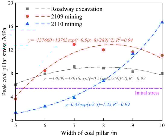 The peak stress of coal pillars across various mining stages was systematically analyzed through curve fitting. The fitting curves, as illustrated in the equation below, demonstrate that the GaussAmp function was employed for nonlinear fitting during roadway excavation and primary mining phases, while the exponential function was utilized for the secondary mining period. The correlation coefficients of 0.92, 0.94, and 0.99, respectively, indicate that the fitted curves accurately represent the data trends.