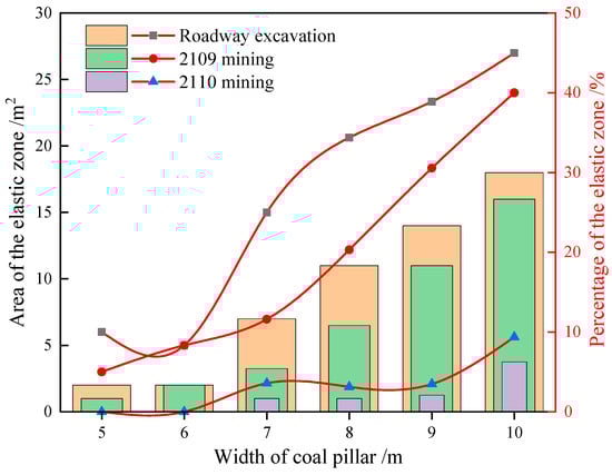With the progressive increase in coal pillar width, a corresponding expansion in both the grid and the proportional extent of the elastic zone was observed across the roadway tunneling, first mining, and second mining stages. During the initial mining phase, the grid proportion of the elastic zone in the 7 m and 8 m coal pillars exhibited the most substantial reductions, decreasing by 13.39% and 14.07%. In comparison to the first mining stage, the secondary mining phase demonstrated a marked reduction in the elastic zone across all wider coal pillars. Notably, the elastic zone completely disappeared in the 5 m and 6 m coal pillars, while the area and proportion of the elastic zone in pillars of 7 m and above in width were significantly diminished.