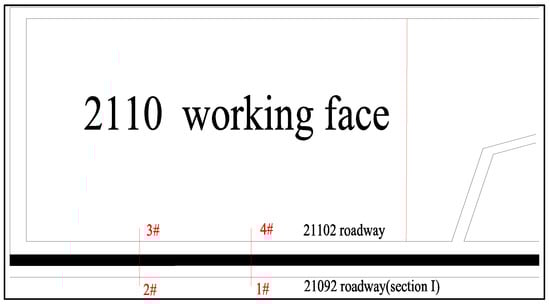 The layout of NCPDRE is shown in Figure 2. When arranging the preparation roadway of working face 1, the return-air roadway of working face 1 and the transport roadway of working face 2 of the next section are excavated at the same time, and a certain width of coal pillar is left between the two roadways. The return-air roadway of the next section does not serve as the working face in this section, but only to alleviate the difficulties of the successive mining and excavation of the mine. In the mining process of working face 1, the overburden roof in the goaf side will be cut off by blasting, hydraulic fracturing, and other methods to avoid the influence of lateral support pressure on the roadway of the next section’s working face 2 after the mining of working face 1 [13].