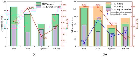 It can be seen from Figure 14a that during the first mining period of the 21092 roadway, compared with the roadway excavation period, the roof subsidence increased by 83%, the floor displacement increased by 128%, the right displacement increased by 33%, and the left displacement increased by 61%. For the 21102 roadway, the roof subsidence increased by 80%, the floor displacement increased by 79%, the right displacement increased by 43%, and the left displacement increased by 15%. The impact on the displacement of the roadway roof and floor was the greatest during the first mining period. The second mining was performed on the solid coal side, which had little impact on the displacement of the coal pillar side. It can be seen from Figure 14b that during the second mining of the 21102 roadway, compared with the first mining, the roof subsidence increased by 6%, the floor displacement increased by 53%, the right displacement increased by 20%, and the left displacement increased by 27%. The impact on the roadway roof deformation during the secondary mining period was the smallest, and the impact on the roadway floor was the largest.