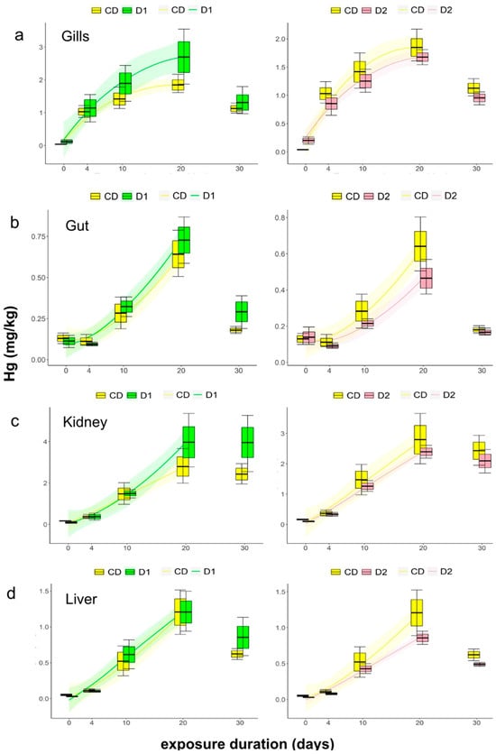 In both the liver and kidney, mercury accumulation follows a linear trend over time. No difference is observed between fish fed with D1 and CD, while the concentrations in fishes fed with the D2 are significantly lower after just 10 days of exposure (Figure 2c,d).