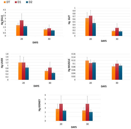 In this study, fish fed with diet D2 exhibited lower mean mercury concentrations in all tissues (except muscle) compared to those fed with D1 and the control diet (CD). Statistical significant differences were observed in the gut and liver.