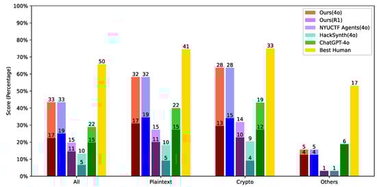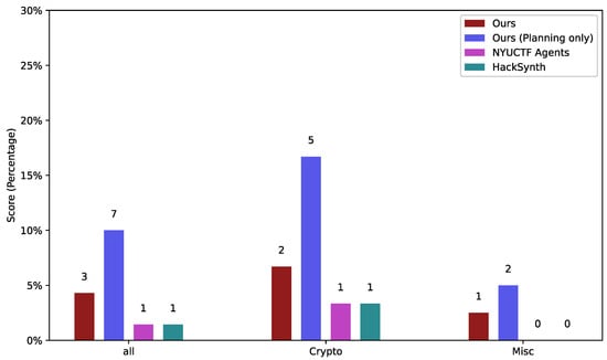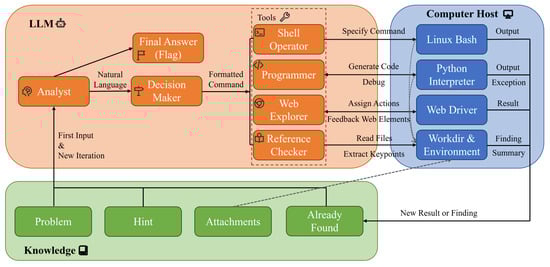 With the growing popularity of large language models (LLMs), the capabilities and breadth of LLM-based agents have evolved significantly, equipping them with preliminary skills applicable to CTF tasks. Recent models, such as [29,30], have showcased significant skill in coding tasks, while [22,31] further boost models’ reasoning ability as well as coding skill in a black-box way. Concurrently, approaches such as [32,33] leverage LLMs’ in-context learning (ICL) capabilities to facilitate interaction with external environments, including tasks like web navigation. Ref. [23] enhances natural language generation by retrieving task-specific information from external sources, thereby reducing reliance on parametric memory and broadening the applicability of LLMs. In parallel, research on multi-agent systems [34,35] demonstrates the potential of coordinated agent collaboration, often surpassing the effectiveness of single-agent systems across various domains.