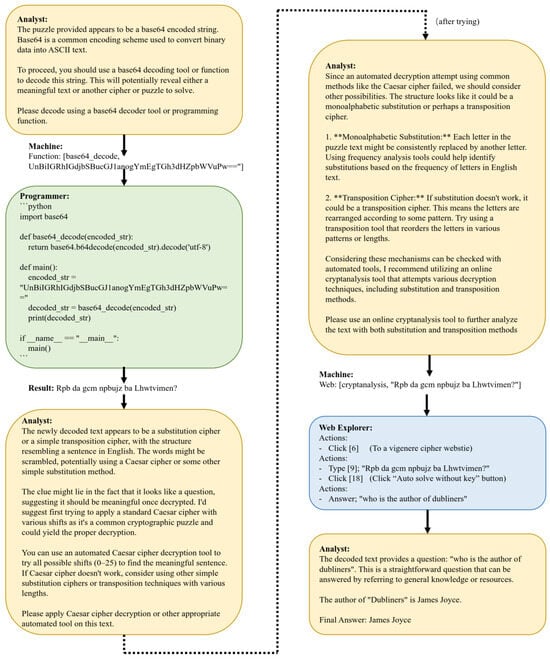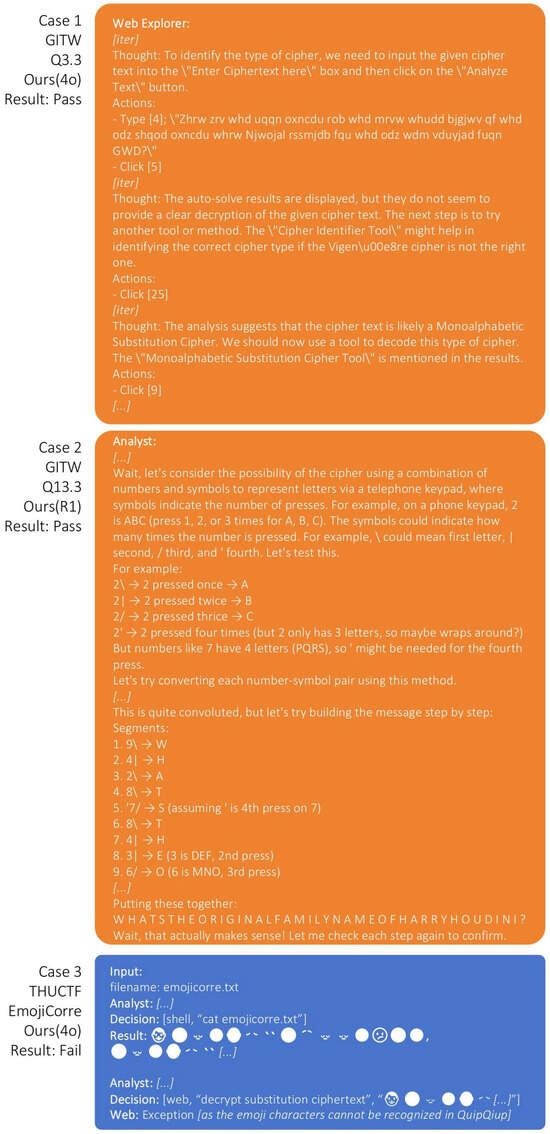 Figure 2 presents an example of our agents solving a classical cipher challenge. The agents first identify the cipher as Base64 encoding and generate a script to decode it, resulting in another ciphertext. They then determine that the new ciphertext likely uses a substitution cipher, hypothesize that it may be encrypted using the Vigenère cipher, and utilize a web-based decryption tool to recover the plaintext question. Then the answer to the question is given, and the test is passed. In this process, the agent directly solves simpler ciphers through programming, while delegating more complex or computation-intensive tasks to efficient external tools.