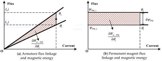 The preceding analysis demonstrates that the magnetic co-energy serves as a scalar potential function for the curl-free component of the flux linkage field under specified initial conditions. Since the permanent magnet flux linkage and initial rotor position are independent of stator current excitation and uniquely determine the integration constants, the total co-energy can be decoupled into a linear current-dependent term and a permanent magnet contribution. Consequently, Equation (18) is reformulated as follows: