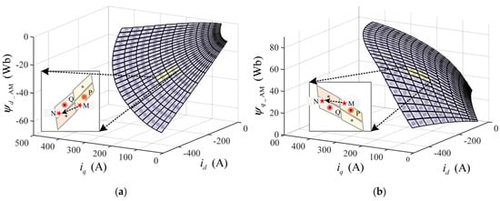 Armature dq flux linkage surface in the OLAM method. (a) d-axis armature flux linkage; (b) q-axis armature flux linkage. Points P and Q denote FEA-sampled current points, while points M and N denote calculated excitation current points. The nonlinear relationship between flux linkage and current is treated as a differentiable manifold, and tangent planes provide an optimal first-order approximation of this surface.