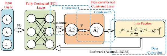 where the superscript denotes the th layer, is the number of hidden layers, , , , are the outputs, activation values, weight matrices, and bias vectors of the th layer, and is the activation function. The fully connected layer is connected to the physical layer. The role of the physical layer is to embed the will physical features of the object into the network by means of hard constraints or loss functions. Take the cosine term Fourier coefficients as an example. The following constraints exist for the PMSM system:
