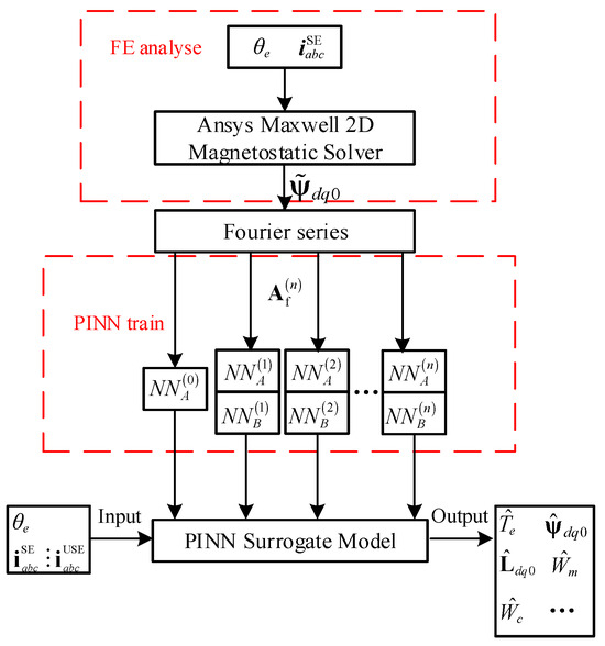 PINNs emerge as a promising solution, grounded in the universal approximation theorem. Their core methodology involves embedding the governing physical equations and boundary conditions directly into the neural network’s loss function. This ensures the back-propagation process inherently respects the underlying physics, enabling the network to iteratively approximate the system’s true physical structure through training [19,20,21]. Crucially, PINNs bypass the need for complex discretization schemes and numerical algorithms typical of traditional PDE solvers. Instead, they leverage automatic differentiation (AD) techniques during backpropagation to accurately characterize differential operators. This AD approach offers robustness against noisy data, a distinct advantage over numerical differentiation methods like finite differences. Furthermore, the inherently meshless nature of PINNs eliminates the tedious process of mesh generation, effectively transforming the complexity of the physical problem into a focused network optimization task. The efficacy of this approach is demonstrated in relevant applications, particularly for PMSM modeling. Xia et al. [22] successfully applied PINNs for parameter identification in PMSMs. Their work constructed a high-fidelity motor model capable of capturing critical nonlinear effects like magnetic saturation and cross-coupling. This was achieved by utilizing polynomial fitting to characterize dq-axis flux–current relationships while embedding the fundamental motor voltage equations into the PINN’s loss function. This physics-constrained framework enabled robust parameter optimization, subsequently validated through both simulation and experiment. The principle of embedding physical knowledge into learning frameworks is also evident in other power electronics domains, as seen in Zeng et al.’s [23] work on optimizing DAB converters using a physics-informed deep transfer reinforcement learning method.
