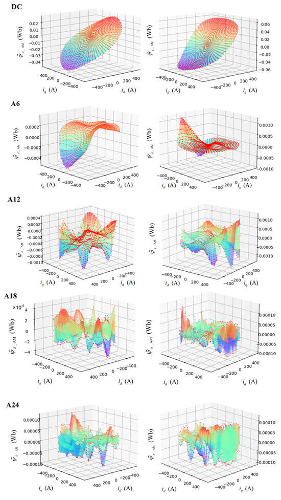 The fitting performance of the PINN model for flux linkage is exemplified by the Fourier cosine coefficients, as illustrated in Figure 7, where the continuous surfaces represent PINN-generated results and solid red dots denote FEA sample points. The results demonstrate that the PINN framework achieves high-fidelity reconstruction of flux linkage harmonics across all orders while simultaneously satisfying both numerical agreement with FEA benchmarks and rigorous physical constraints—including curl-free field conditions and specified initial/boundary requirements.