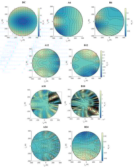 The PINN provides a continuously differentiable model for the PMSM, enabling systematic analysis of their electromagnetic field characteristics. As shown in Figure 8, the Fourier coefficient distribution of the armature magnetic co-energy is visualized alongside the flux linkage vector coefficients (indicated by red arrows). Notably, the flux linkage Fourier coefficient vectors remain perpendicular to the armature co-energy contour lines at all positions, numerically confirming the gradient relationship defined in (42). With increasing harmonic orders, both the armature co-energy and flux linkage distributions exhibit heightened spatial complexity, particularly in saturation-governed weak magnetic regions where localized field variations intensify. These nonlinear saturation effects manifest as sharp transitions in physical quantities and non-orthogonal harmonic interactions, demonstrating the intrinsic nonlinear behavior of PMSM under high saturation conditions.
