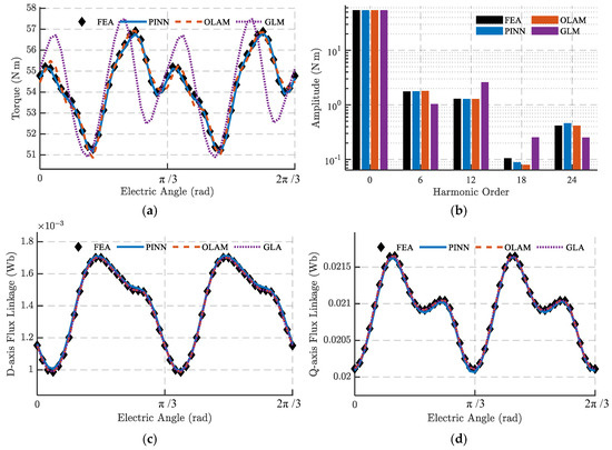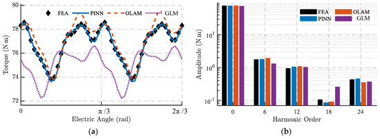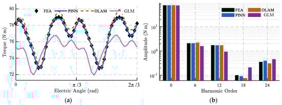 Figure 12 presents a comparison of the torque and flux linkage results obtained by the GLM, PINN, and OLAM methods against those from FEA. Among the three, GLM exhibits the largest deviation, with an EDS reaching 27.02. The PINN model predicts torque more accurately than OLAM—its outputs align closely with non-FEA sampling points, as anticipated from the SE condition analysis. Specifically, OLAM yields a maximum torque error of 1.28 and an EDS of 6.8, whereas PINN reduces these to 0.37 and 1.52, corresponding to just 22% and 29% of the OLAM values, respectively. Apart from the 18th-order harmonic, PINN also outperforms OLAM in estimating both average torque and the amplitude of each harmonic order, as shown in Figure 12.