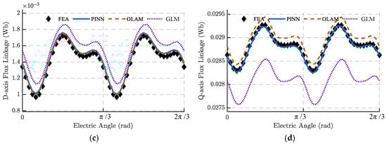 When the operating point deviates from the FEA sampling point (, ), it is evident that, due to severe magnetic saturation in the weak-field region, the GLM exhibits the largest errors, and the torque and armature flux linkage results in Figure 10 indicate that OLAM—which constructs a locally linearized model based on flux linkage, magnetic co-energy, and differential inductance at the nearest FEA sampling point—loses accuracy in the weak-field region due to the motor’s complex nonlinear behavior. Although OLAM can approximate torque with a mean error of 5.4 ‰ and an EDS of approximately 5.8, its flux linkage error is notably larger. In contrast, at non-FEA sampling points, the PINN model still delivers high-precision torque and flux linkage predictions, with torque mean error and EDS reduced to only 8% and 16% of OLAM’s values, respectively, demonstrating excellent generalization capability.