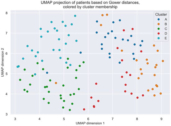 The two-dimensional UMAP projection, applied to the Gower distance matrix, enabled visual inspection of patient distribution. This representation shows a coherent grouping of individuals according to cluster assignment, with some overlap, as expected. The layout supports the internal validity of the model and aligns with the modest silhouette score. Figure 3 illustrates this distribution, with color and letter codes (A–E) for clarity.